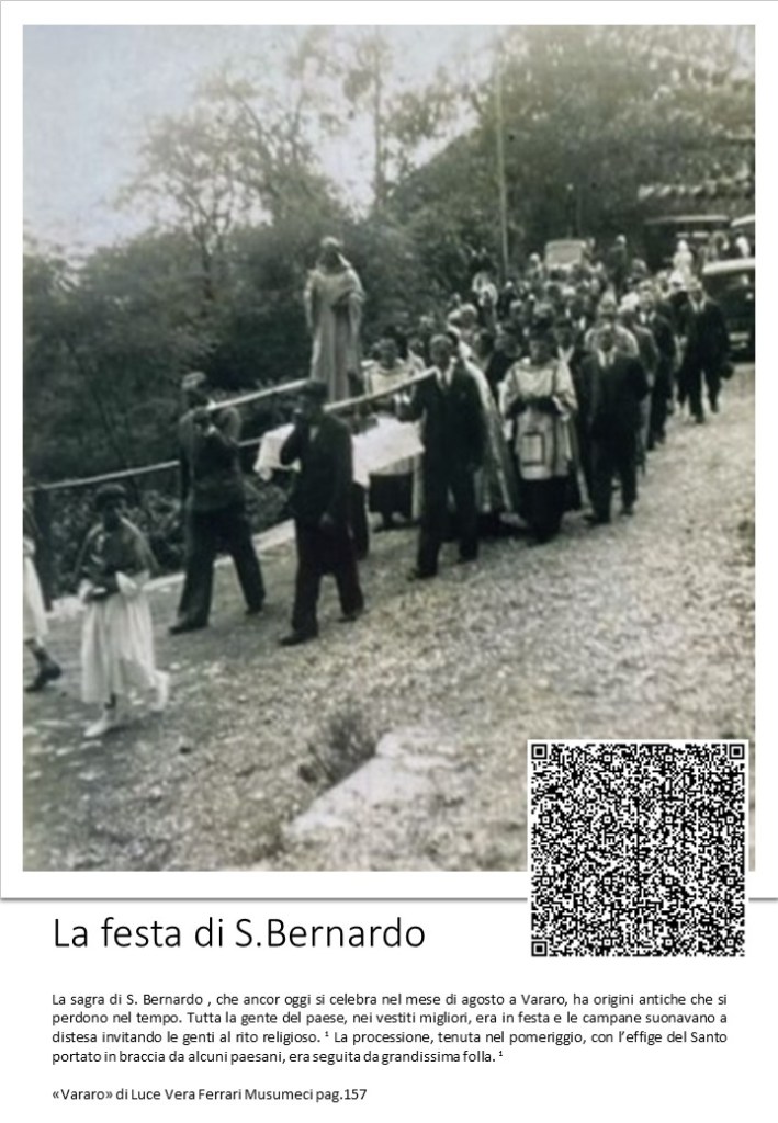 La sagra di S. Bernardo , che ancor oggi si celebra nel mese di agosto a Vararo, ha origini antiche che si perdono nel tempo. Tutta la gente del paese, nei vestiti migliori, era in festa e le campane suonavano a distesa invitando le genti al rito religioso. ¹ La processione, tenuta nel pomeriggio, con l’effige del Santo portato in braccia da alcuni paesani, era seguita da grandissima folla. ¹